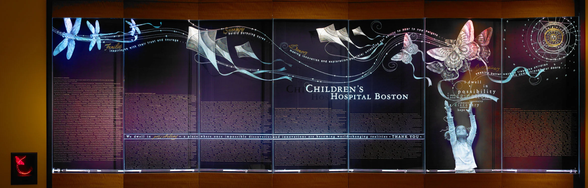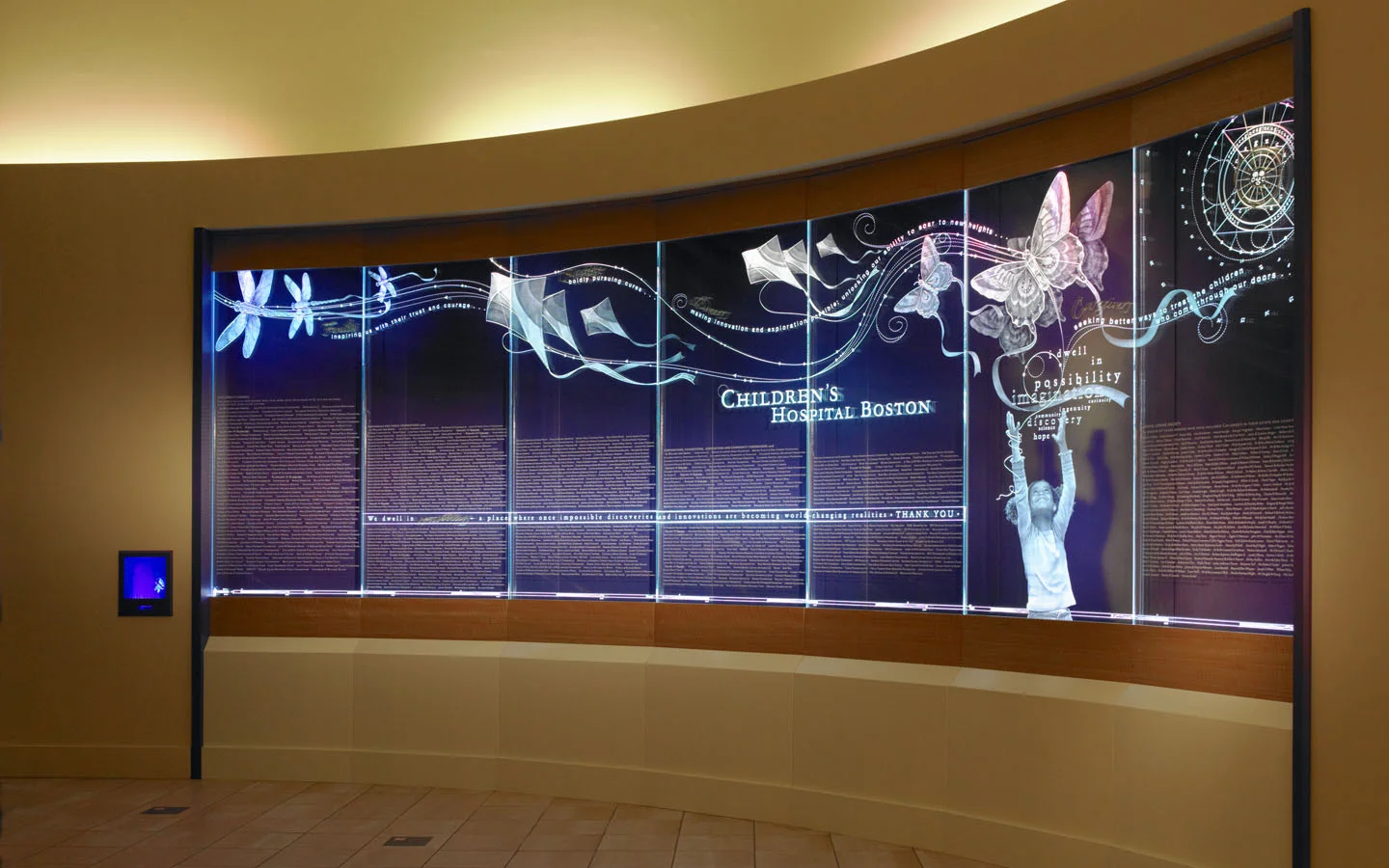 This 18-foot-wide carved and etched crystal Donor Wall is as dynamic and child-focused as the institution where it is installed: Computer-controlled LEDs light up the graphic elements in sequence, changing color and intensity. The effect is to make it appear as if a kite in the shape of a butterfly lifts up out of a child’s hands and flies across the wall. Then the lighting fades and the cycle restarts. The crystal panels on the wall swivel on custom hinges, giving easy access to a second layer, where Donor Names are silk-screened onto acrylic panels mounted and clearly visible behind the crystal. This design makes it a simple task to update Donor Names.