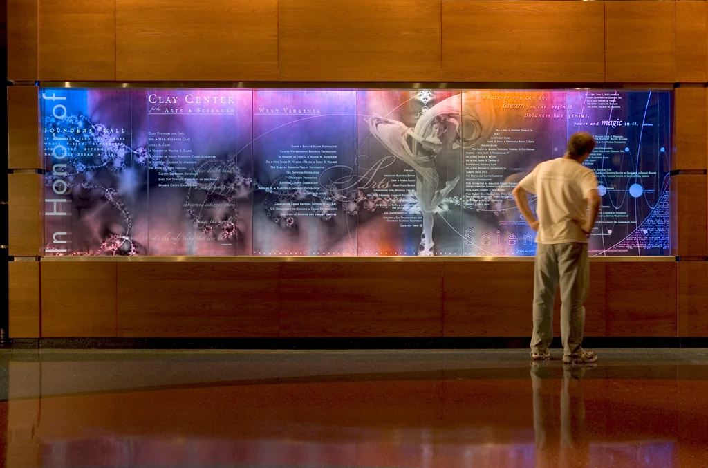 The etching is illuminated by softly colored LEDs programmed to shift slowly, in five-minute cycles, from the deep indigo and purples of the night sky to the apricot and pink tones of dawn. Names of major donors float prominently on their own top layer in brilliant white light.