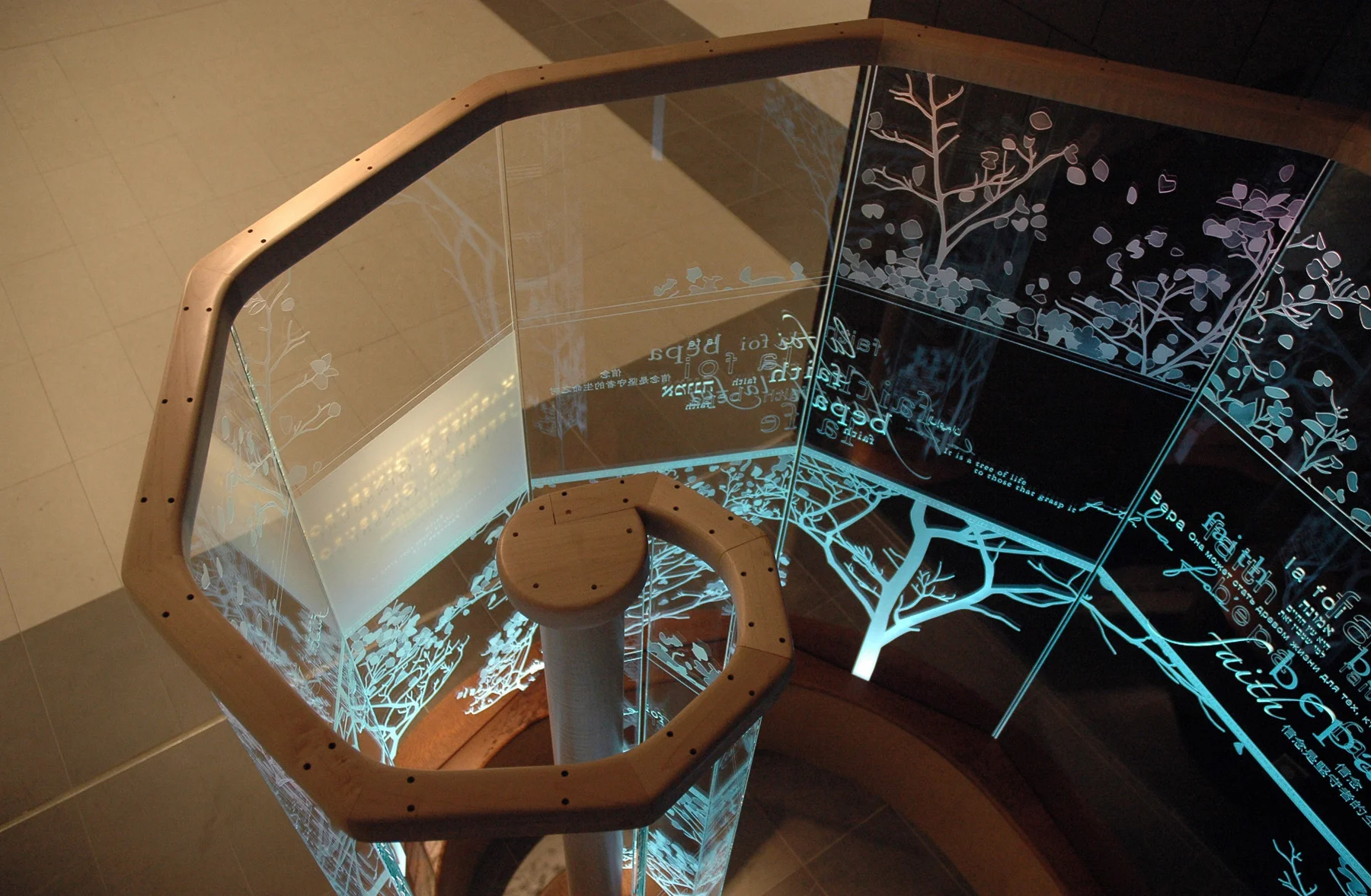 Overlapping images of leafy trees make the spiral a memorial grove, while also referencing the quotation. The quotation itself, rendered in eight languages is carved to varying depths in panels of half-inch-thick domestic crystal. The many different fonts used have lyrical, calligraphic, traditional and contemporary looks, appealing to young and old of every culture and tradition.