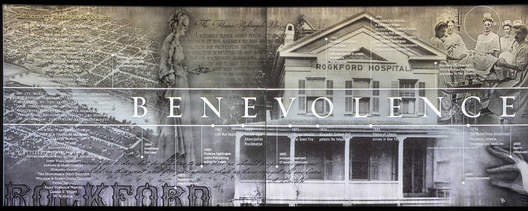 The design intent was to HONOR. This Hospital and Medical Center has existed within and supported the community since the 1860's. The Heritage Center begins with its traffic-stopping image of a 3-dimensional and life-sized small boy pointing up at a crystal story plaque. "Freddie", the child whose death inspired an entire town to create its original hospital, starts an intricate, multi-layered and dimensional TIMELINE, which flows from the 1830's to today and into the future.