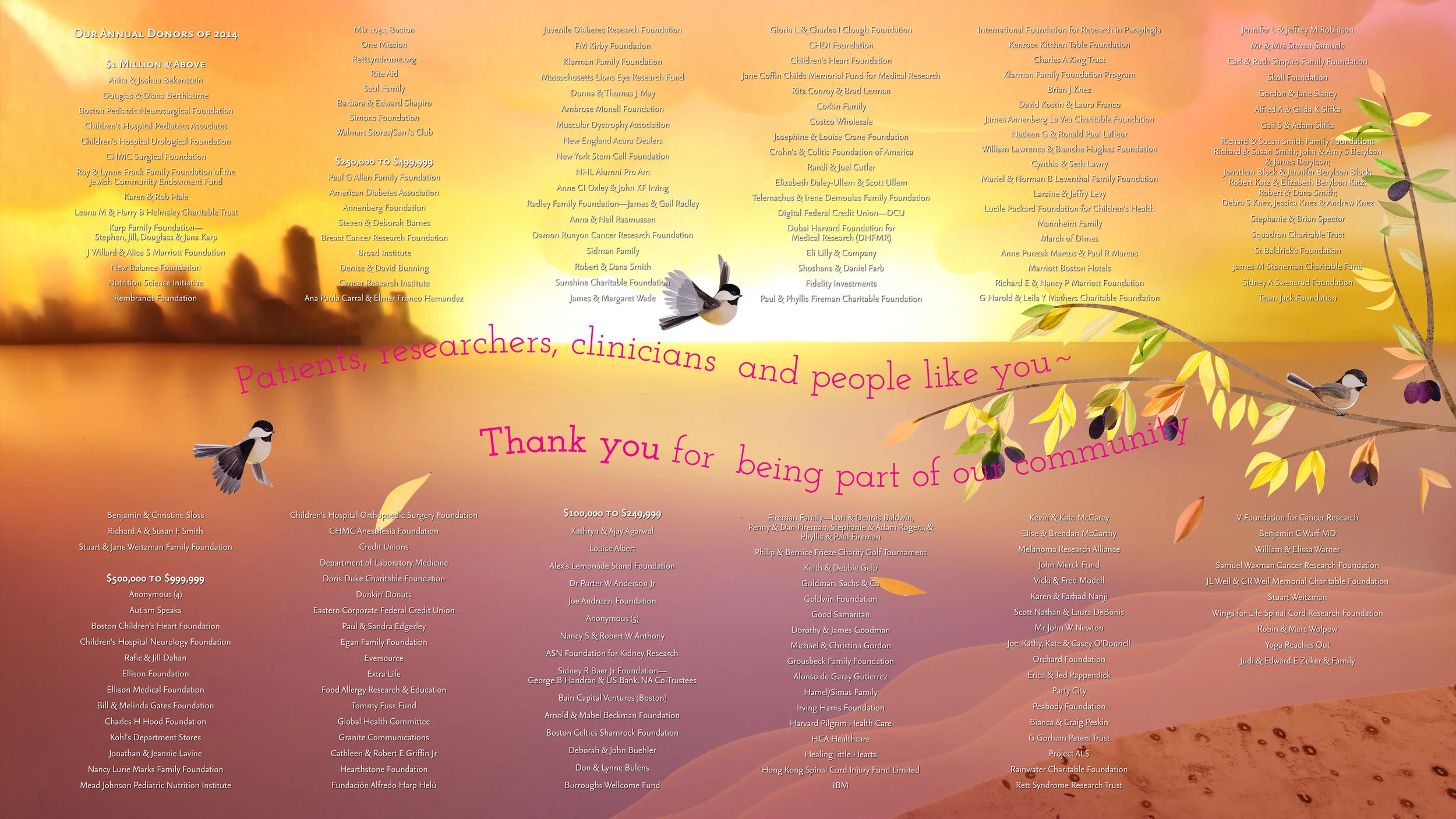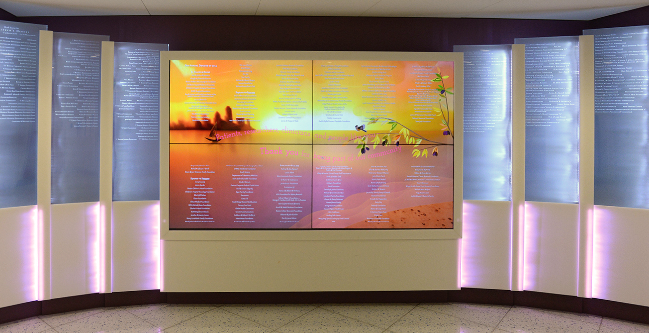 Part of our design intent was to create a state-of-the-art Donor Wall that would mirror Boston Children's forward-thinking advances in technology while retaining their long-established tradition of child-sensitive, compassionate care. The result was an entirely new kind of Donor Recognition: permanent but changeable; modern yet reassuringly traditional, sophisticated yet child-friendly.